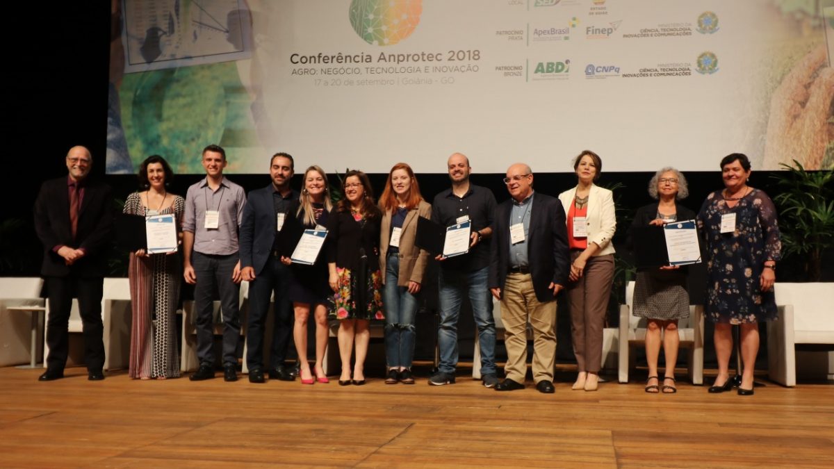 José Alberto Sampaio Aranha, presidente da Anprotec, Célio Cabral, gerente de Acesso à Inovação e Tecnologia do Sebrae, Luís Afonso Bermúdez, ex-presidente da Anprotec e presidente do Conselho Deliberativo do Sebrae no Distrito Federal e Carmem Gondim, gerente da Unidade de Inovação e Competitividade do Sebrae-GO, fizeram a entrega dos certificados.