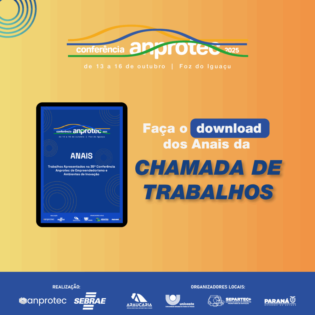 Os Anais da Conferência Anprotec de Empreendedorismo e Ambientes de Inovação 2025 já estão disponíveis. O evento, realizado em Foz do Iguaçu (PR), reuniu gestores de ambientes de inovação, pesquisadores, empresas, representantes do governo e universidades entre os dias 13 e 16 de outubro de 2025.