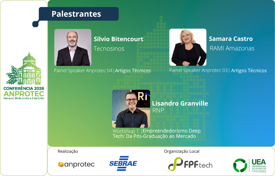 A 36ª Conferência Anprotec de Empreendedorismo e Ambientes de Inovação divulga novos palestrantes que farão parte da extensa programação do evento. A Conferência será realizada de 29 de junho a 2 de julho, em Manaus (AM). Samara Castro, Lisandro Granville e Silvio Bitencourt trarão diferentes perspectivas sobre o fortalecimento de ecossistemas de inovação, conectando ciência, gestão e desenvolvimento territorial.