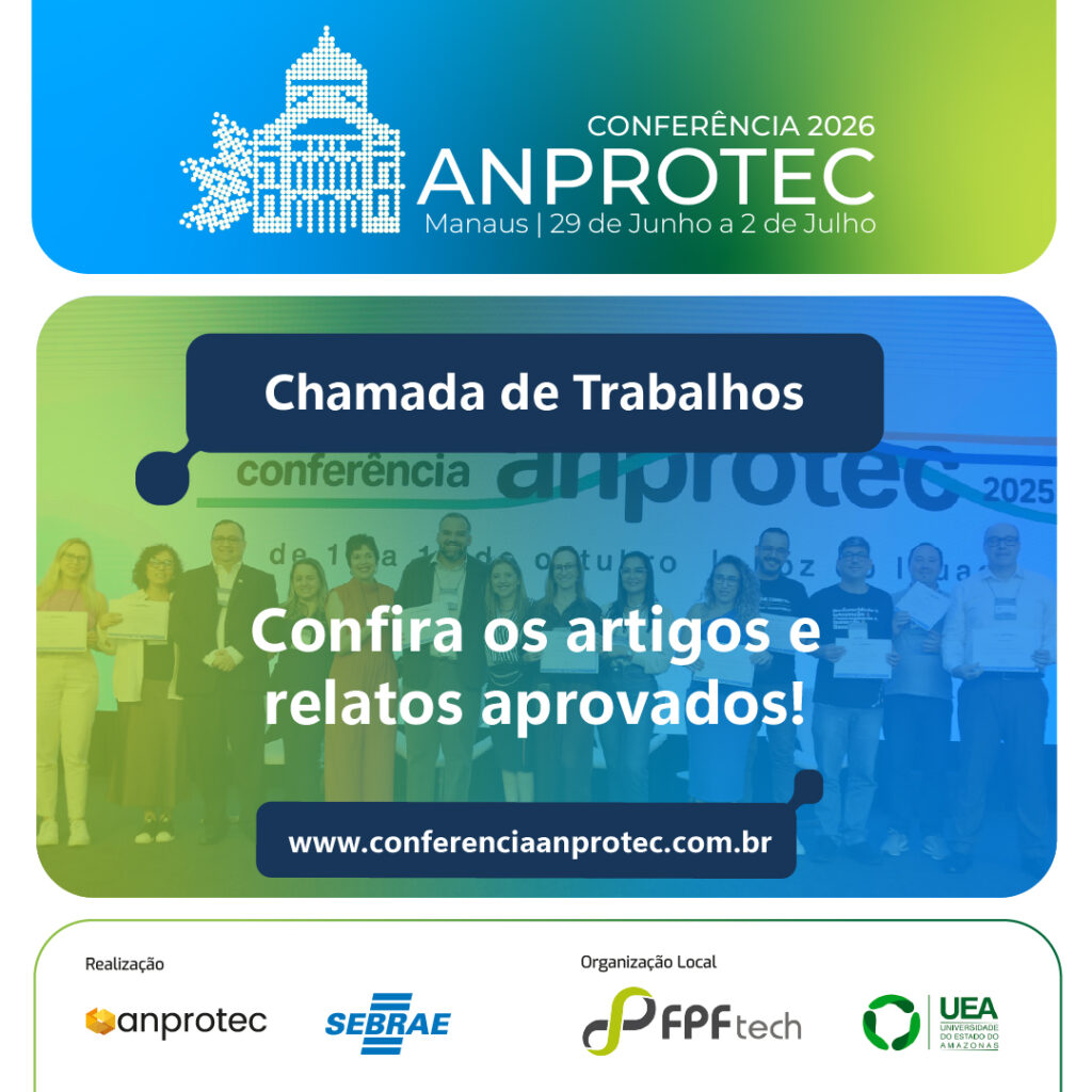 A Conferência Anprotec 2026 é promovida pela Associação Nacional de Entidades Promotoras de Empreendimentos Inovadores (Anprotec), em parceria com o Sebrae, com realização local da Fundação Paulo Feitoza (FPF Tech) e da Universidade Estadual do Amazonas (UEA).