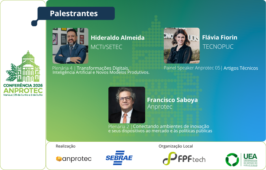 A 36ª Conferência Anprotec de Empreendedorismo e Ambientes de Inovação confirma novos nomes que farão parte da sua extensa programação. O evento será realizado de 29 de junho a 2 de julho, em Manaus (AM). Flávia Fiorin, Francisco Saboya e Hideraldo Almeida trarão diferentes perspectivas sobre o fortalecimento dos ambientes de inovação, conectando gestão de ecossistemas e desenvolvimento tecnológico.