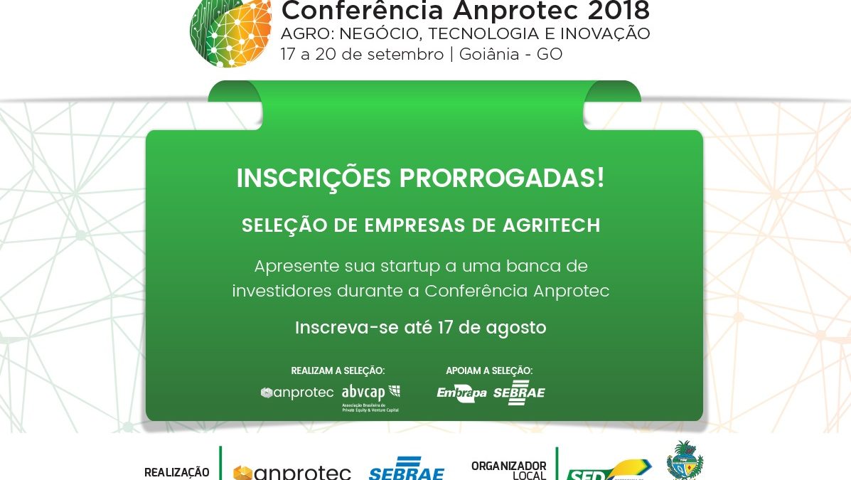 As inscrições para startups de Agritech participarem do processo seletivo e se apresentarem a uma banca de investidores durante a Conferência Anprotec 2018 foram prorrogadas até o dia 17 de agosto.