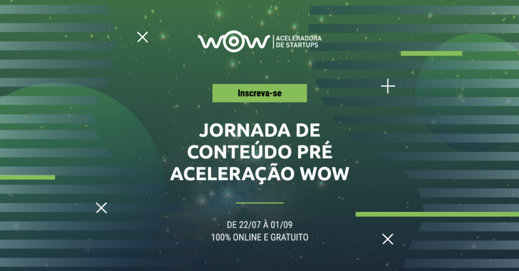 Entre os dias 22/7 e 01/9, acontecerá a Jornada de Conteúdo Pré Aceleração WOW, organizado pela WOW Aceleradora. O evento será totalmente online e gratuito.