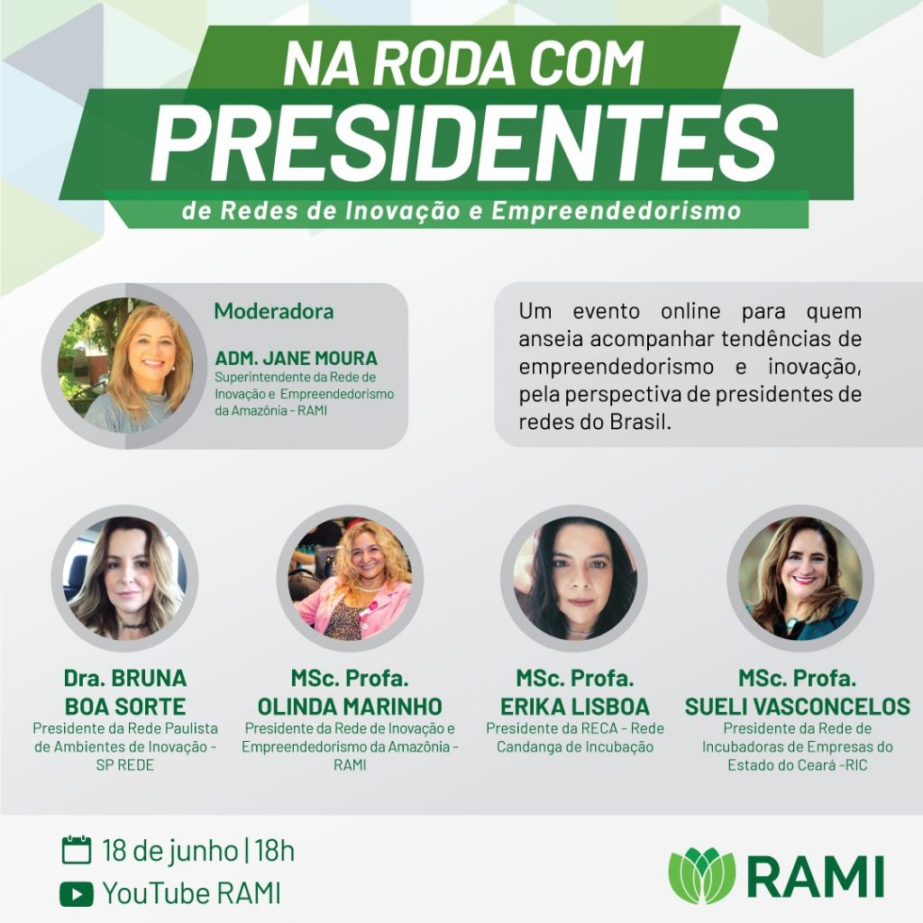 Em sua 1º edição online, a Roda com a RAMI apresenta o painel “Na roda com presidentes de redes de inovação e empreendedorismo” e leva em consideração o pós-pandemia, com o objetivo de apresentar o papel das redes no apoio aos ambientes de inovação associados, bem como discussões acerca da maior inserção das mulheres nos empreendimentos, da virtualização dos empreendimentos e do cenário brasileiro em relação ao contexto global.