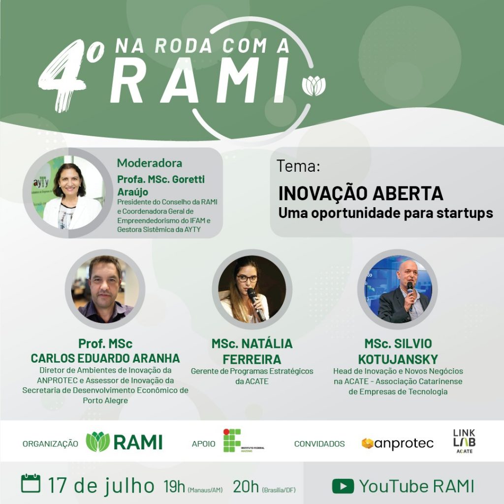 Amanha, sexta-feira, 17 de julho, às 20h acontece a 4ª roda com a RAMI, com o tema “Inovação Aberta – oportunidade para as startups.