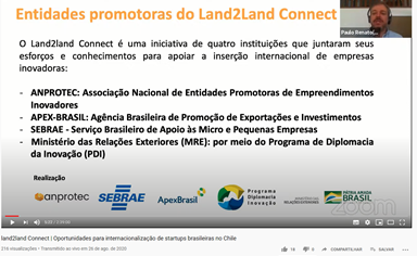 Moderado pelo diretor de relações internacionais da Anprotec, Rodrigo Mendes, o land2land Connect Santiago teve início com a participação do gerente de inovação do Sebrae Nacional, Paulo Renato Cabral, que falou sobre a iniciativa dos encontros virtuais, a escolha dos ecossistemas e a programação do dia.
