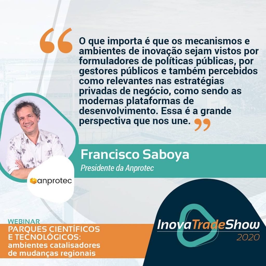 Francisco Saboya, presidente da Anprotec – que reúne entre seus associados incubadoras, parques tecnológicos, aceleradoras, coworkings, instituições de ensino e pesquisa etc – considera que com uma sociedade mais digital e conectada, a inovação é o diferencial e as cidades são obrigadas a se estruturarem de uma nova forma. “Os parques tecnológicos, com todos os seus mecanismos, são uma saída para o país que deve ser reproduzida e multiplicada, cada qual com sua especificidade.”