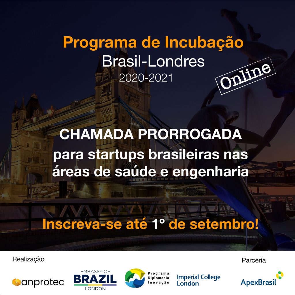 Com o objetivo de apoiar o desenvolvimento e a internacionalização de empreendimentos brasileiros nas áreas de saúde e engenharia, a Anprotec, juntamente com a Embaixada do Brasil no Reino Unido, a Agência Brasileira de Promoção de Exportações e Investimentos (Apex-Brasil) e o Imperial College London prorrogam o período de inscrição da chamada do Programa de Incubação Brasil-Londres 2020 até o dia 1º de setembro. A iniciativa consiste na imersão de startups brasileiras no ecossistema de inovação da cidade de Londres, no Reino Unido.