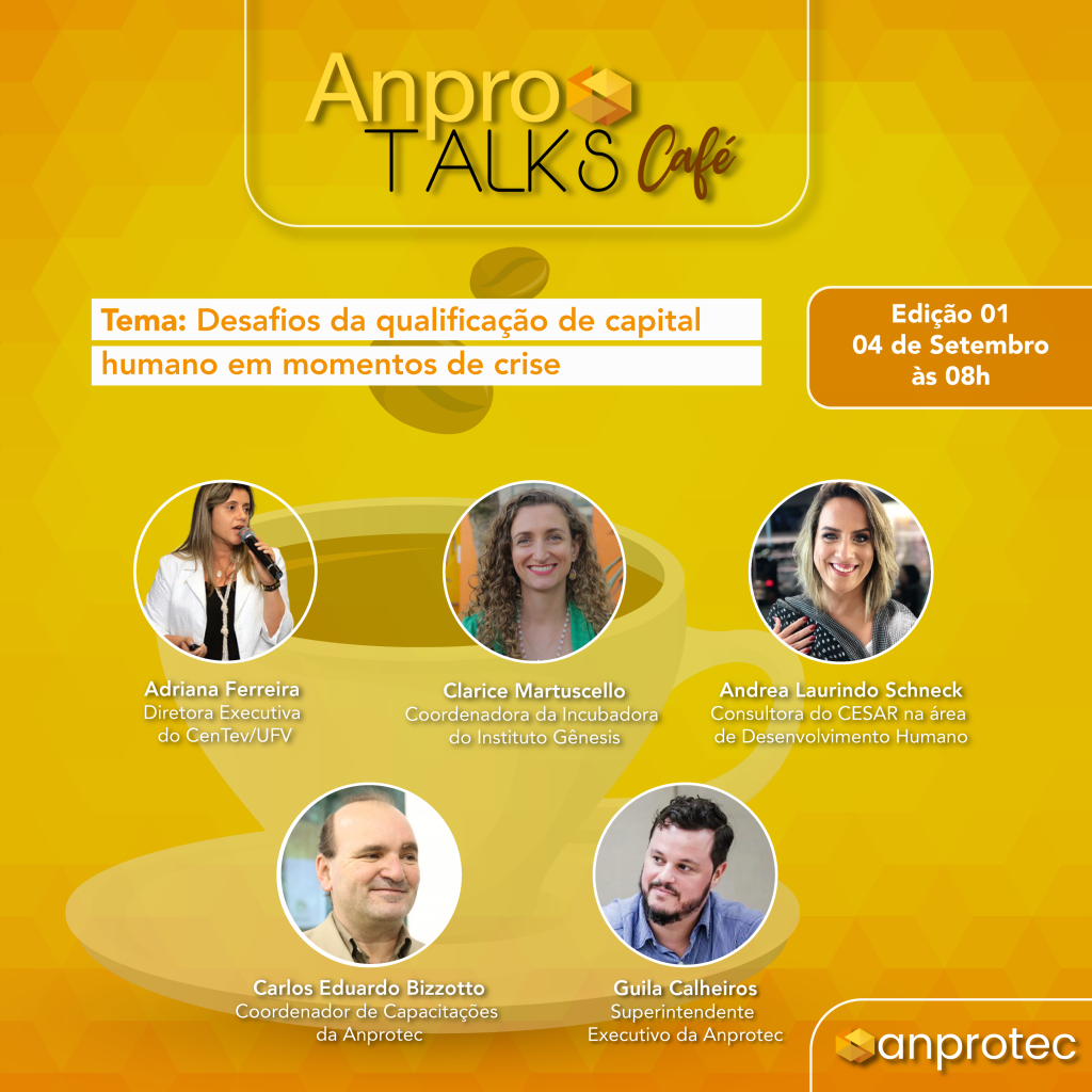 Nessa sexta-feira, 04 de setembro, às 08h, acontece o lançamento e a 1ª edição do AnproTalks Café – uma spin-off do AnproTalks para debater assuntos de interesse já levantados junto ao público envolvido no movimento de ambientes de inovação, como associados e parceiros da Anprotec.