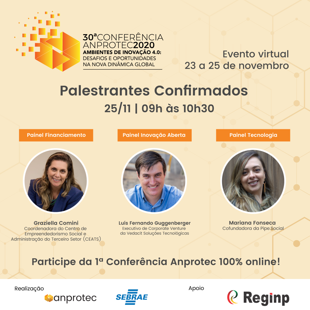 Já temos os primeiros palestrantes confirmados para participar da 30ª Conferência Anprotec de Empreendedorismo e Ambientes de Inovação, que, nesse ano, acontece de forma online de 23 a 25 de novembro, com o tema central “Ambientes de Inovação 4.0: Desafios e Oportunidades na Nova Dinâmica Global” e cinco subtemas: