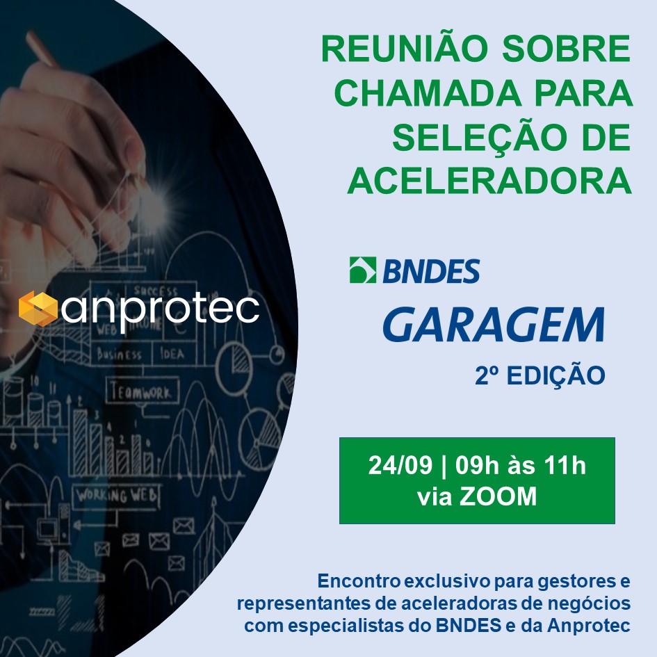 Nesse sentido, a Anprotec convida gestores e representantes de aceleradoras de negócios a participar de um encontro online exclusivo com representantes do BNDES, no dia 24 de setembro das 09h às 11h, para saber mais sobre essa oportunidade e tirar quaisquer dúvidas.