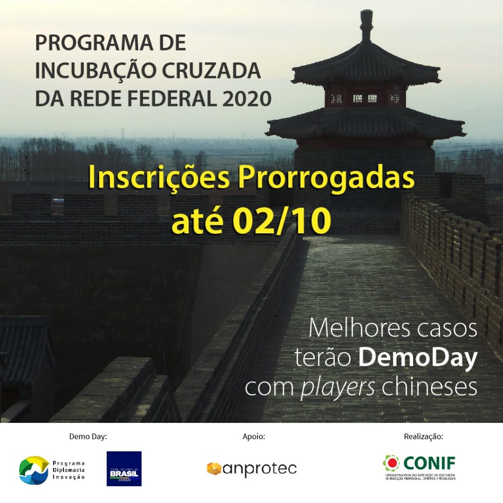 O Conselho Nacional das Instituições da Rede Federal de Educação Profissional, Científica e Tecnológica (Conif), com o apoio da Associação Nacional de Entidades Promotoras de Empreendimentos Inovadores (Anprotec), está com inscrições abertas para o Programa de Incubação cruzada da Rede Federal. A iniciativa é inovadora, e visa cruzar as oportunidades de ações conjuntas e prospecção de novas parcerias entre os ecossistemas da Rede. A inscrição e credenciamento dos ambientes de empreendedorismo inovadores foram prorrogadas até 2 de outubro de 2020.