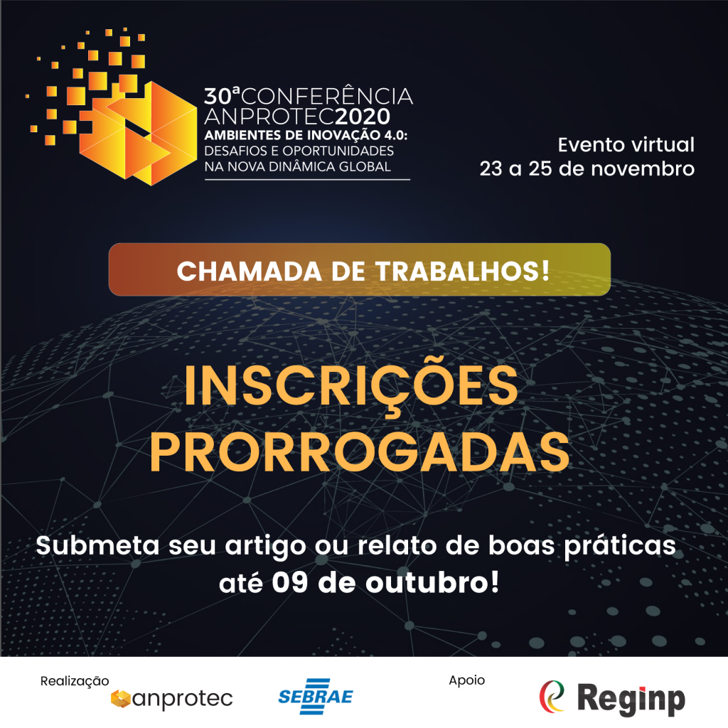 Já estão abertas as inscrições para participar da Chamada de Trabalhos da 30ª edição da Conferência Anprotec de Empreendedorismo e Ambientes de Inovação, que acontece de modo virtual de 23 a 25 de novembro, com o tema central “Ambientes de Inovação 4.0 – Desafios e Oportunidades na Nova Dinâmica Global”.