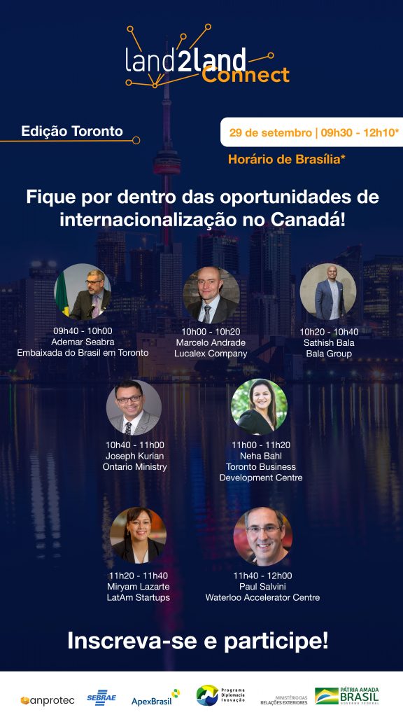 A terceira edição do land2land Connect – evento virtual que conecta startups brasileiras, com interesse em iniciar ou acelerar seu processo de internacionalização, aos ambientes e mecanismos de inovação estrangeiros qualificados a operar programas de softlanding, incubação e aceleração – acontece na terça-feira, 29 de setembro das 09h30 às 12h10 (horário de Brasília) no canal da Anprotec no Youtube, sobre o ecossistema de inovação de Toronto.