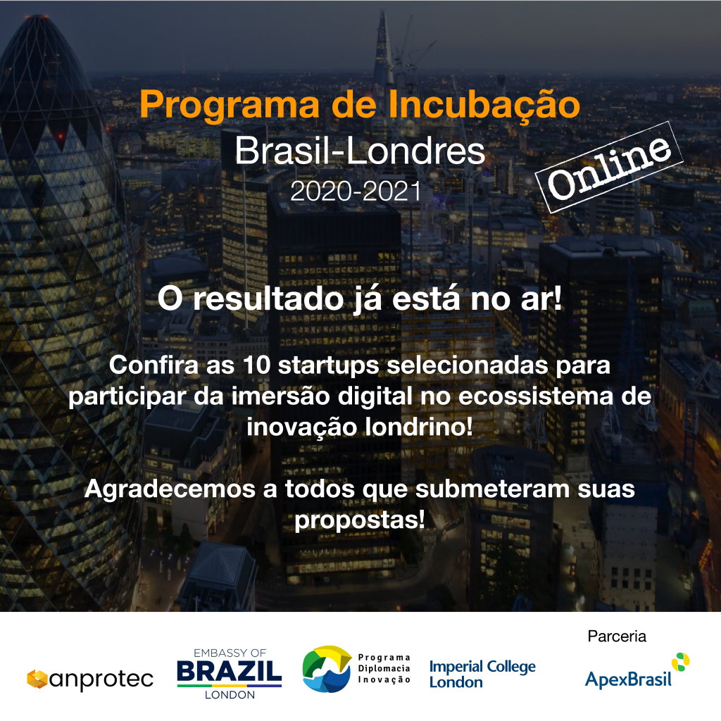 Com o objetivo de apoiar o desenvolvimento e a internacionalização de empreendimentos brasileiros nas áreas de saúde e engenharia, a Anprotec, juntamente com a Embaixada do Brasil no Reino Unido, a Agência Brasileira de Promoção de Exportações e Investimentos (Apex-Brasil) e o Imperial College London, lançou em junho desse ano a chamada do Programa de Incubação Brasil-Londres 2020. A iniciativa consiste na imersão de startups brasileiras no ecossistema de inovação da cidade de Londres, no Reino Unido.