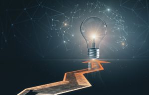 Creative background with arrows and glowing lamp. Idea and innovation concept. 3D Rendering