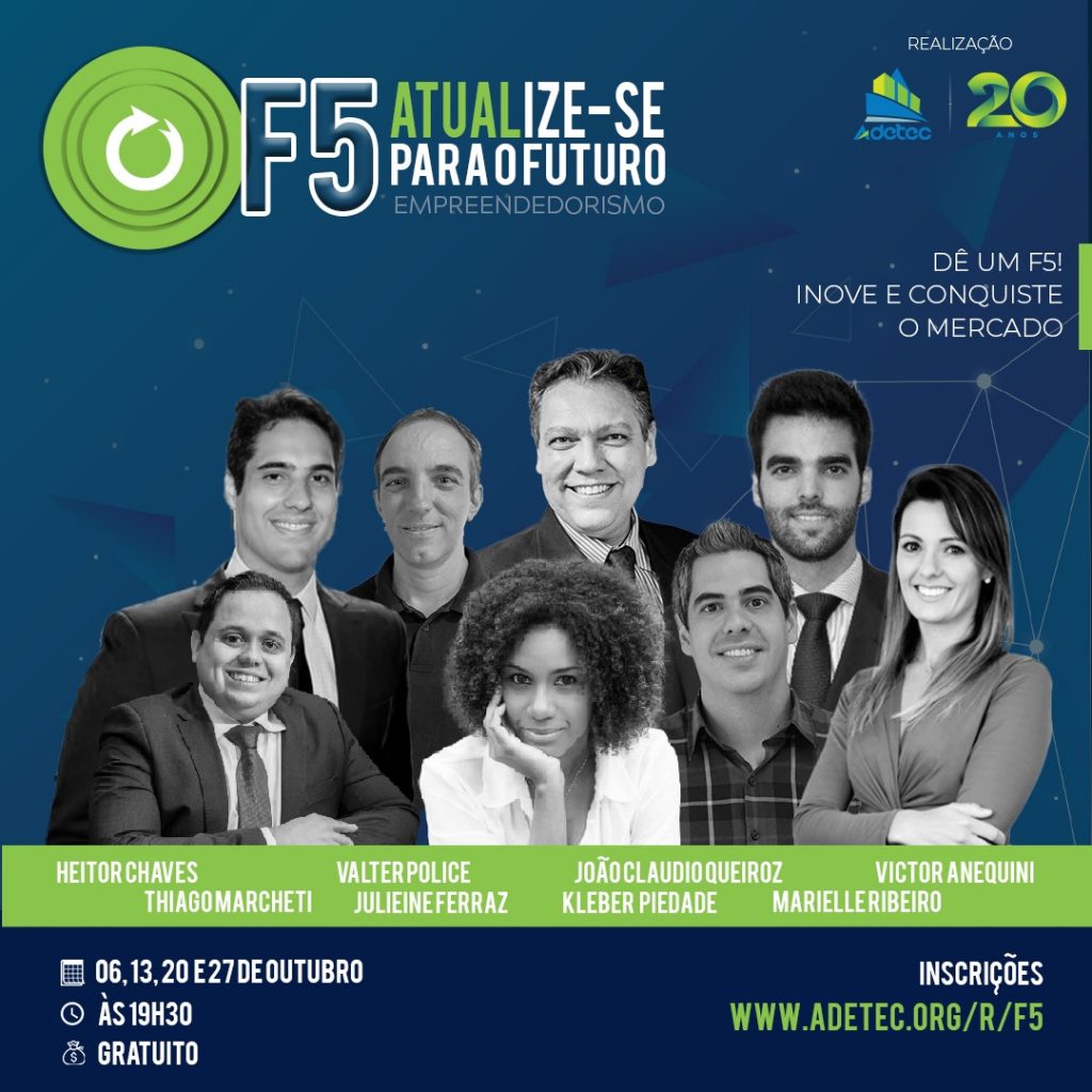 E em outubro, o mês do empreendedor, haverá quatro oportunidades para empresários e profissionais de diversas áreas se atualizarem em temas importantes. A Adetec (Agência de Desenvolvimento Econômico e Tecnológico de Lins) está lançando o evento F5: Atualize-se para o Futuro, que será totalmente online e gratuito. “O evento proporcionará aos participantes a oportunidade de obterem novos conhecimentos, conhecerem histórias inspiradoras, ampliarem a rede de contatos e conectarem com Adetec e os seus programas. Estamos inovando e oferecendo o F5, um evento totalmente online e inovador. Clique e participe.”, convida Flávio Anequini, gerente da Incubadora de Empresas de Lins, programa gerenciado pela Adetec.