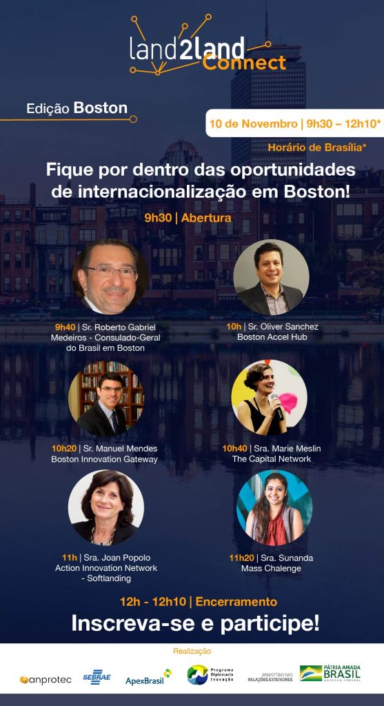 A penúltima edição do land2land Connect – evento virtual que conecta startups brasileiras, com interesse em iniciar ou acelerar seu processo de internacionalização, aos ambientes e mecanismos de inovação estrangeiros qualificados a operar programas de softlanding, incubação e aceleração – acontece na terça-feira, 10 de novembro das 09h00 às 12h10 (horário de Brasília) no canal da Anprotec no Youtube, sobre o ecossistema de inovação de Boston.