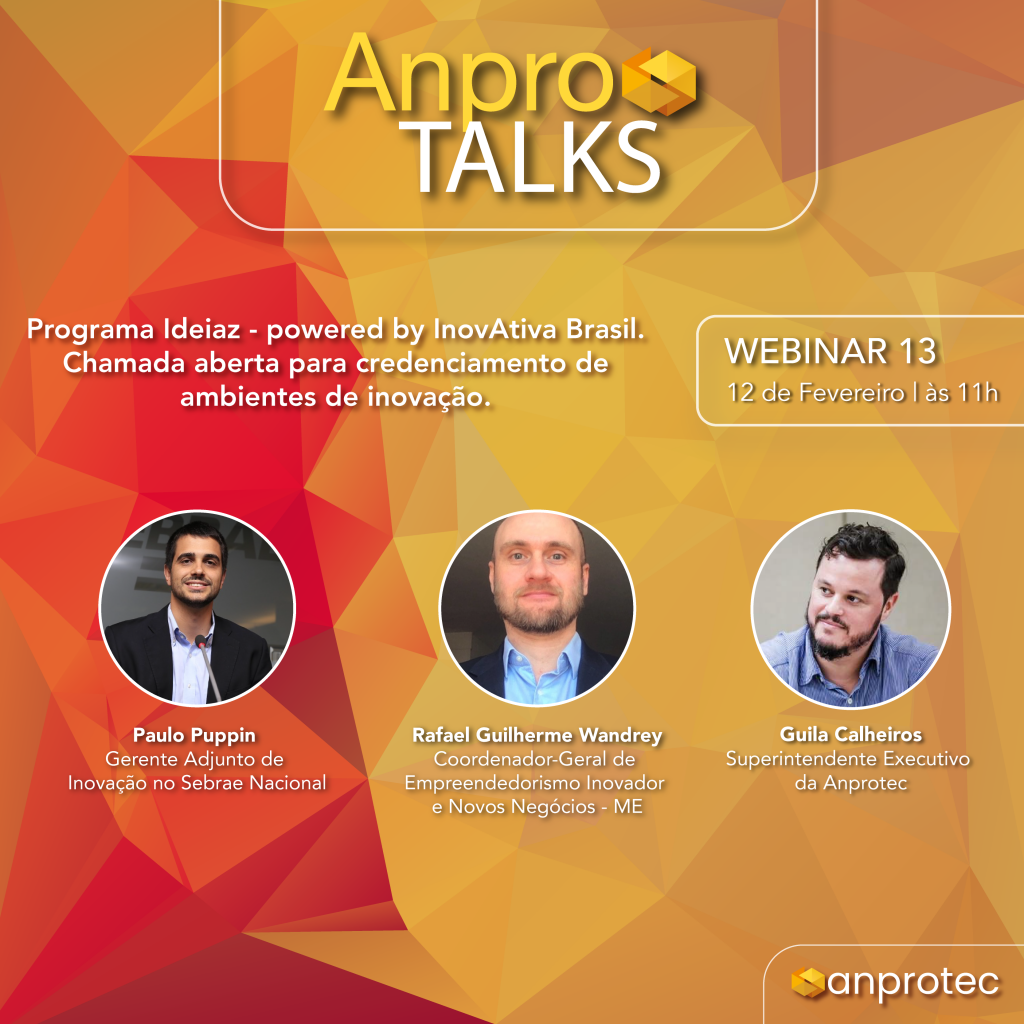 A 13ª edição do AnproTalks traz três representantes dos realizadores do Programa Ideiaz – powered by InovAtiva, lançado em 09 de fevereiro com a abertura da chamada nacional para credenciamento de incubadoras e aceleradoras no 1º ciclo do programa.