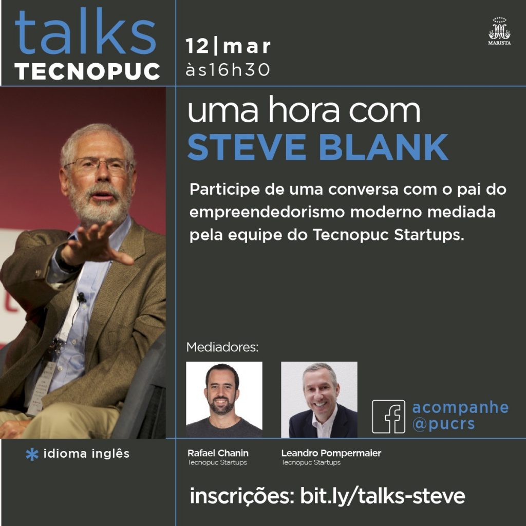 No próximo Tecnopuc Talks, uma série sobre inovação e empreendedorismo promovida pelo Parque Científico e Tecnológico da PUCRS (Tecnopuc), a equipe do Tecnopuc Startups irá mediar a edição especial “Uma hora com Steve Blank”. O evento, com transmissão ao vivo e em inglês, será dia 12/03, às 16h30. As inscrições são gratuitas e estão disponíveis neste link.