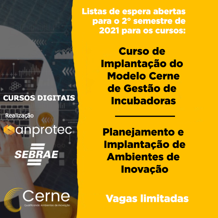 Os cursos digitais realizados pela Anprotec de “Planejamento e Implantação de Ambientes de Inovação” e “Implantação do Modelo Cerne” estão com listas de espera abertas para o segundo semestre de 2021.