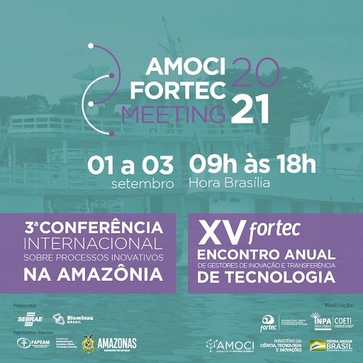 De 01 a 03 de setembro, será realizado o AMOCI FORTEC Meeting 2021 que tem como anfitriões o Arranjo de Núcleos de Inovação Tecnológica (NIT) da Amazônia Ocidental (Arranjo Amoci) e o Instituto Nacional de Pesquisas da Amazônia (Inpa/MCTI).