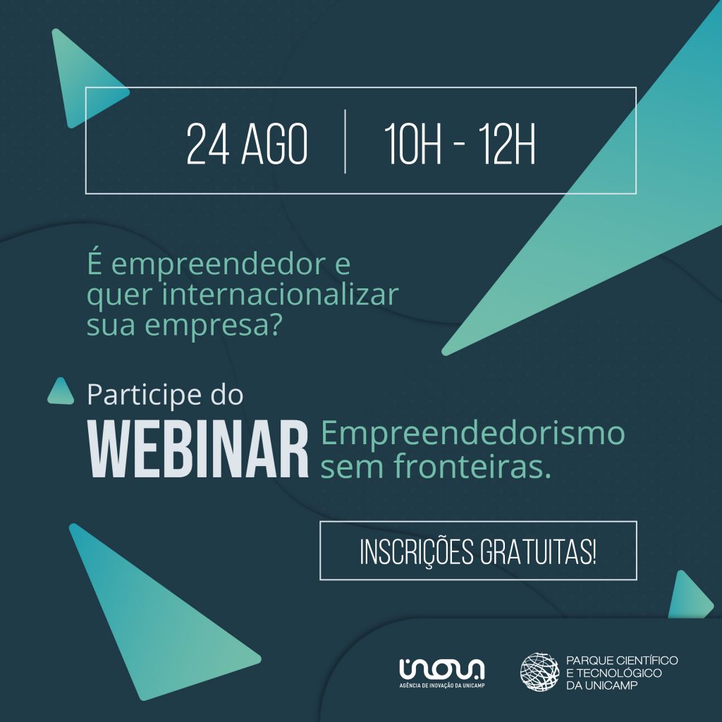No dia 24/8, às 10h, acontece o webinar ‘Empreendedorismo sem fronteiras: como internacionalizar sua empresa’. O evento será realizado pela Agência de Inovação Inova Unicamp e o Parque Científico e Tecnológico da Unicamp.