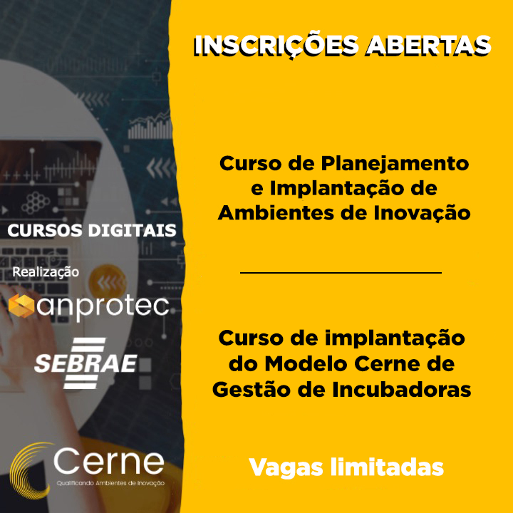 Os cursos digitais realizados pela Anprotec de “Planejamento e Implantação de Ambientes de Inovação” e “Implantação do Modelo Cerne” estão com inscrições abertas.