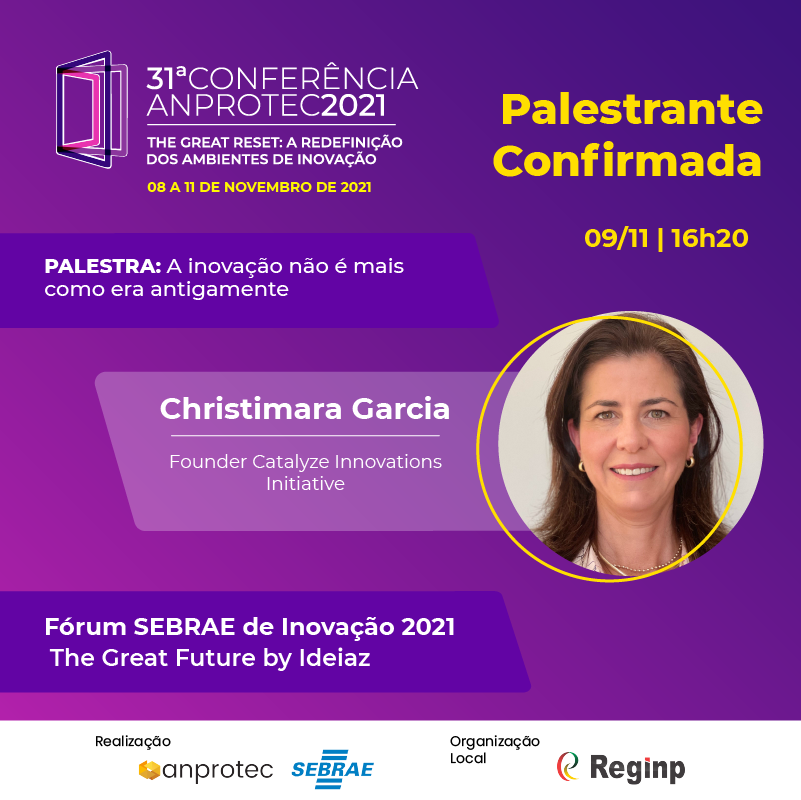 A Conferência Anprotec, é realizada em parceria com o SEBRAE, e acontecerá de 8 a 11 de novembro, totalmente online e gratuita para os associados Anprotec e colaboradores do SEBRAE*. Neste ano o tema central será ‘The Great Reset: A Redefinição dos Ambientes de Inovação’.