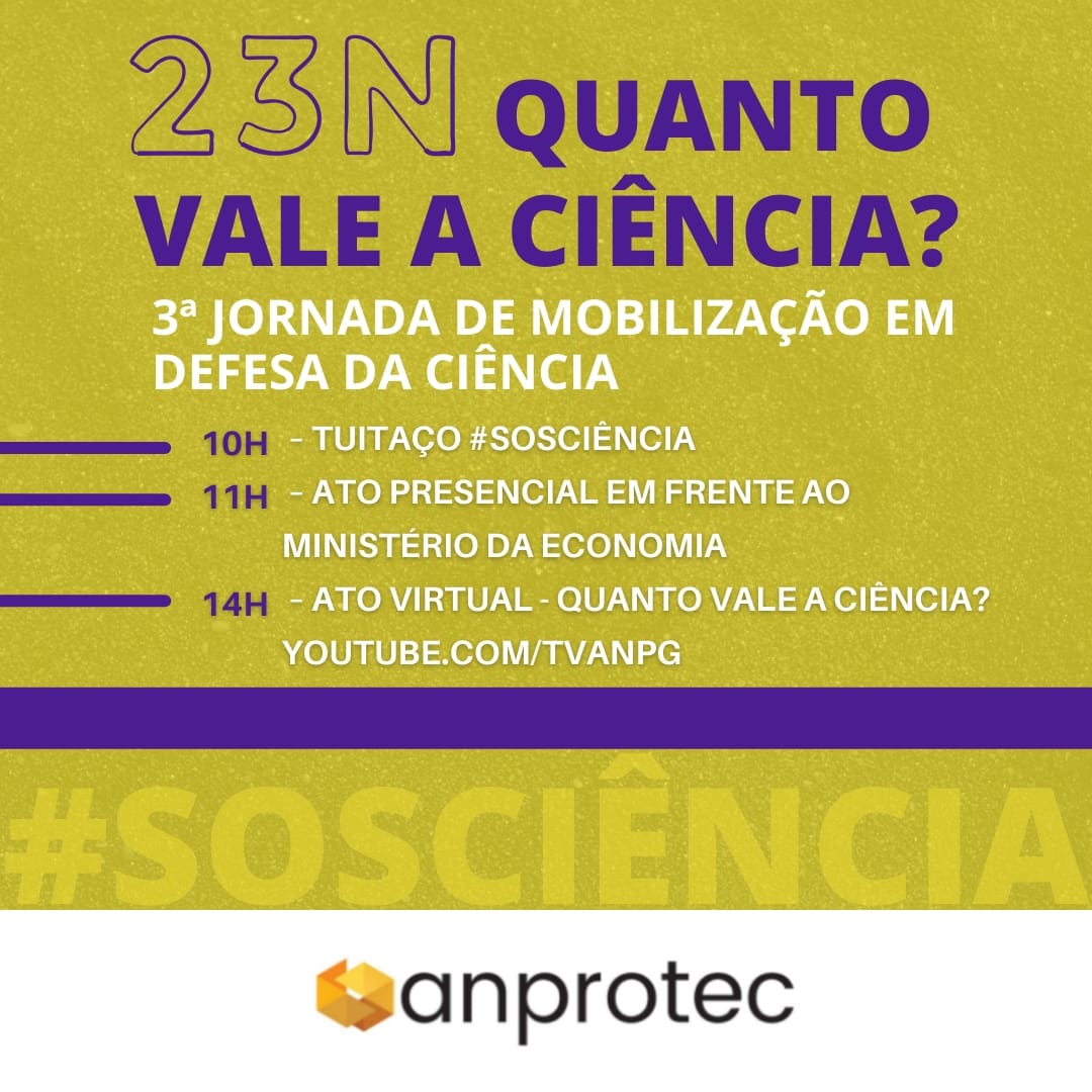 Por isso, amanhã, dia 23 de novembro, acontecerá a 3ª Jornada de Mobilização em Defesa da Ciência. Com atividades online e presenciais, a mobilização terá o mote “Qual o valor da ciência?”, por meio de tuitaço, e atos presencial e virtual. A iniciativa é das entidades que compõem o Comitê Executivo da ICTP.br e diversas outras como a ANPG e o Proifes. #SOSCIÊNCIA.