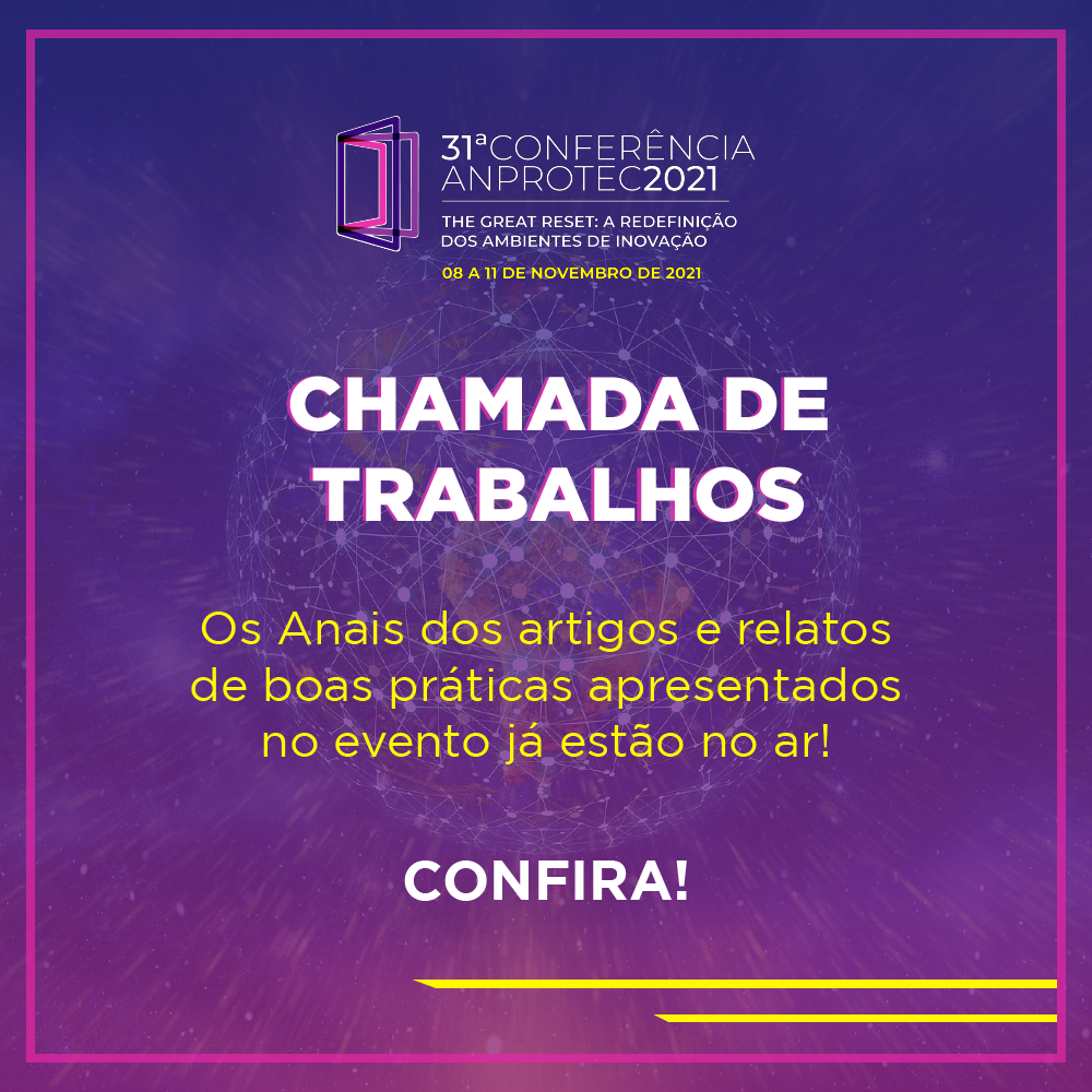 Nos dias 10 e 11 de novembro aconteceram as apresentações online dos trabalhos selecionados pela Chamada de Trabalhos da 31ª edição da Conferência Anprotec de Empreendedorismo e Ambientes de Inovação, que teve como tema central “The Great Reset: a redefinição dos ambientes de inovação”.