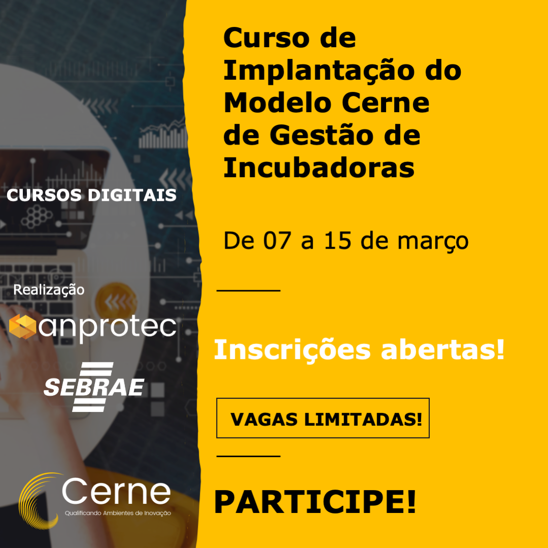 Como o objetivo de tornar os participantes capazes de planejar e implantar os processos e práticas propostas pelo Modelo Cerne, a Anprotec apresenta mais uma edição digital do curso de Implantação do Modelo Cerne de Gestão de Incubadoras.