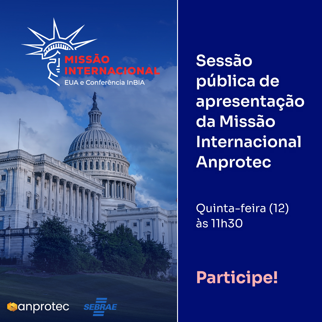 Na próxima quinta-feira (12), às 11h30, você é o nosso convidado para participar da sessão pública de apresentação da Missão Internacional da Anprotec, que acontece de 19 a 30 de junho e terá como destino Boston e Atlanta (Conferência InBIA), nos Estados Unidos.