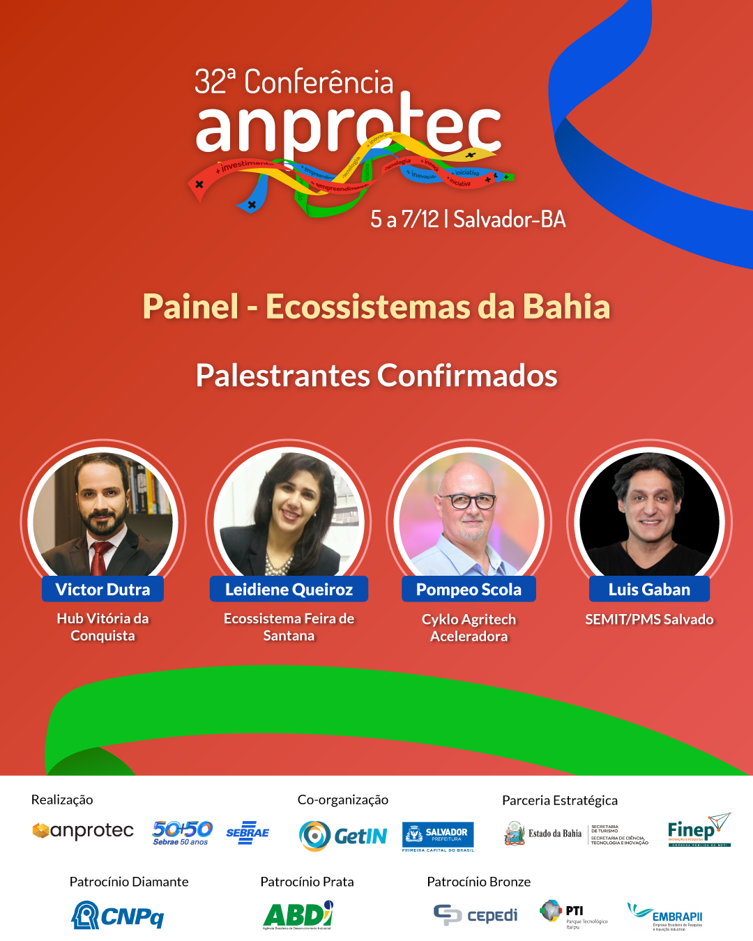A 32ª Conferência Anprotec acontece de 5 a 7 de dezembro, em Salvador – BA e terá como tema “200 Anos de Independência: Inovação e Tecnologia do Brasil”.