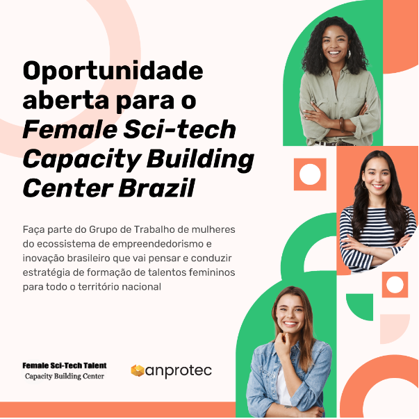 A Anprotec, em associação com a plataforma Female Sci-Tech Capacity Building Center Talent, está com uma oportunidade para identificar e selecionar mulheres colaboradoras do ecossistema de inovação e empreendedorismo brasileiro que tenham interesse em participar de um grupo de trabalho para desenho de estratégia e execução de iniciativa feminina de talentos para todo o território nacional voltados às áreas de ciência e tecnologia inovadoras.