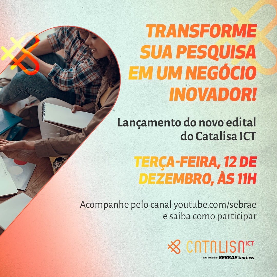 Convidamos para evento Lançamento do Edital Catalisa ICT – Projetos de Inovação, que ocorrerá amanhã, dia 12 de dezembro, às 11h, no link https://www.youtube.com/watch?v=MmgfUyIzQ88.