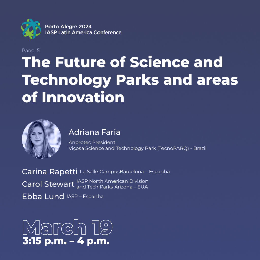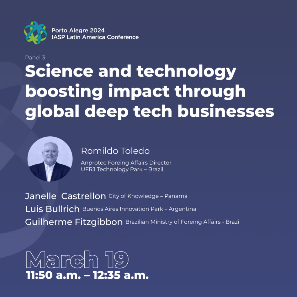 Hoje (19), o diretor de Relações Internacionais da Anprotec, Romildo Toledo, e a presidente, Adriana Ferreira de Faria, estarão presentes no evento nos painéis sobre “Ciência e tecnologia aumentando o impacto por meio de negócios globais de tecnologia profunda” e “O futuro dos parques científicos e tecnológicos e das áreas de inovação”, respectivamente.