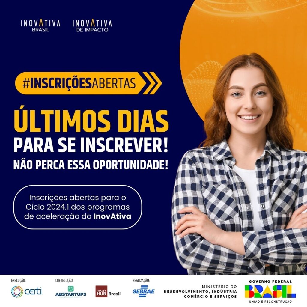 Maior programa de aceleração de startups da América Latina, o InovAtiva Brasil vai selecionar até 200 negócios de todo o país que estejam nas fases de validação, operação e tração para a primeira edição do ano. Já o InovAtiva de Impacto Socioambiental, focado em empresas com missão de gerar impacto social ou ambiental positivo, vai escolher até 80 startups. Ambos os programas são de abrangência nacional e oferecem capacitação, conexão e mentorias aos participantes.