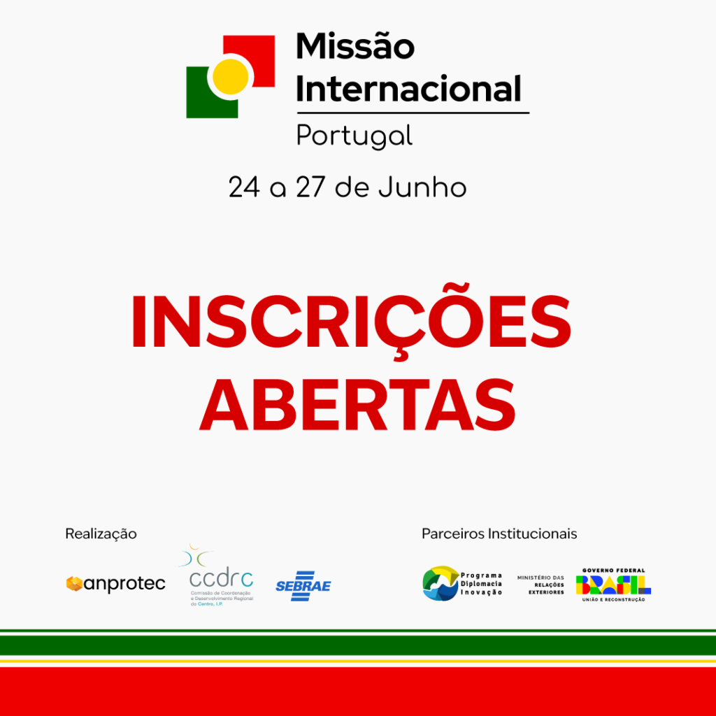 A Anprotec, em parceria com o Sebrae, o Ministério das Relações Exteriores (MRE) e a Comissão de Coordenação e Desenvolvimento Regional do Centro (CCDRC), de Portugal, realizará uma Missão para a Região Central de Portugal, que ocorrerá entre os dias 24 e 27 de junho de 2024.