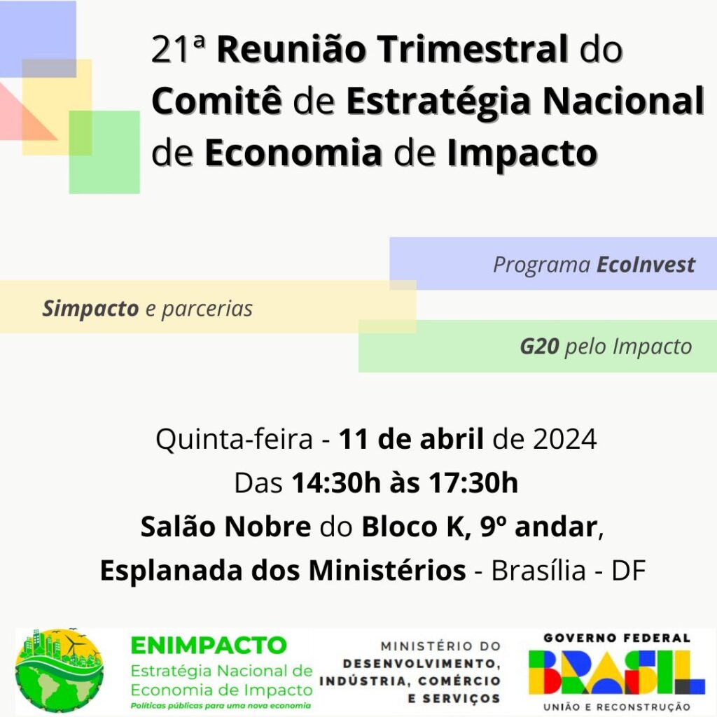 Na próxima quinta-feira (11), às 14h30, acontece a 21ª Reunião Trimestral do Comitê de Estratégia Nacional de Economia de Impacto. A reunião discutirá o Sistema Nacional de Economia de Impacto e a proposta de parceria com o estado do RN. Além disso, será abordado o Programa EcoInvest junto ao Tesouro Nacional, mais uma aproximação para o ecossistema de impacto. Também será construída a agenda no âmbito do G-20.