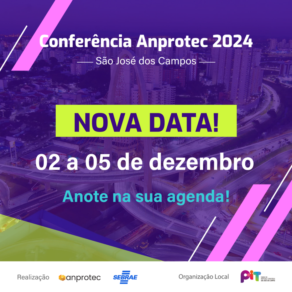 A 34ª edição da Conferência Anprotec, que será realizada em São José dos Campos – SP, terá uma nova data! Anote em sua agenda, de 2 a 5 de dezembro, teremos o nosso tradicional encontro de ambientes de inovação que reunirá grandes nomes do ecossistema de inovação.