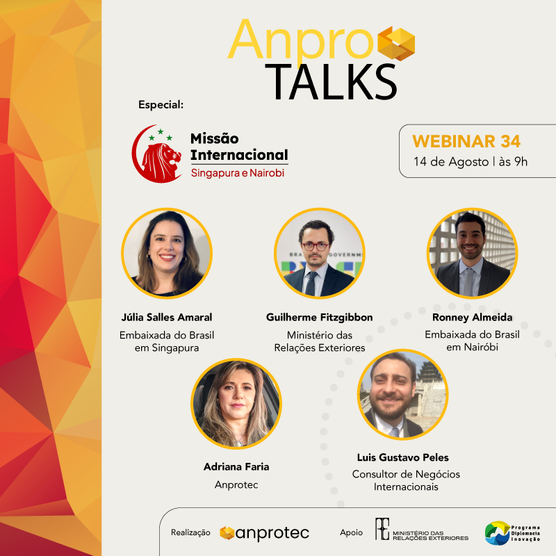 No dia 14 de agosto, às 9h, ocorrerá a 34ª edição do Anprotalks! Esta edição abordará a Missão Internacional da Anprotec 2024, que explorará o ecossistema de inovação em Singapura e contará com a participação na 41ª Conferência da IASP (International Association of Science Parks and Areas of Innovation) em Nairóbi, Quênia.