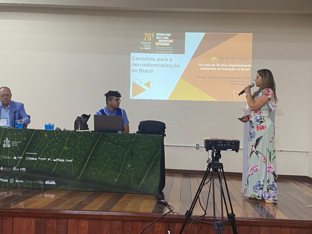 A presidente da Associação Nacional de Entidades Promotoras de Empreendimentos Inovadores (Anprotec), Adriana de Faria, participou da mesa redonda: Caminhos para a Neo-Industrialização do Brasil, durante a 76ª Reunião Anual da Sociedade Brasileira para o Progresso da Ciência (SBPC), realizada na Universidade Federal do Pará (UFPA), em Belém. Participaram também da mesa representantes da Financiadora de Estudos e Projetos (Finep), Confederação Nacional da Indústria (CNI), e da Universidade Federal do Rio de Janeiro (UFRJ). “Esse assunto na SBPC é uma discussão muito importante porque a gente traz a inovação como meio da promoção dos produtos, serviços, processos para essa nova indústria preocupada com a inclusão social, com o desenvolvimento ambiental, com a redução de impactos ambientais, mas que principalmente é capaz de resolver problemas sociais pela geração de emprego e renda de qualidade”, declara Adriana.