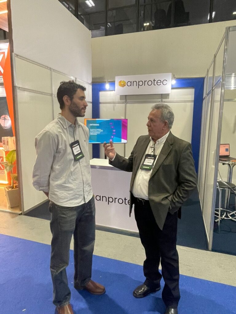 Luís Gustavo Peles, consultor de internacionalização da Anprotec, e Carlos Alberto Costa no estande da Anprotec.