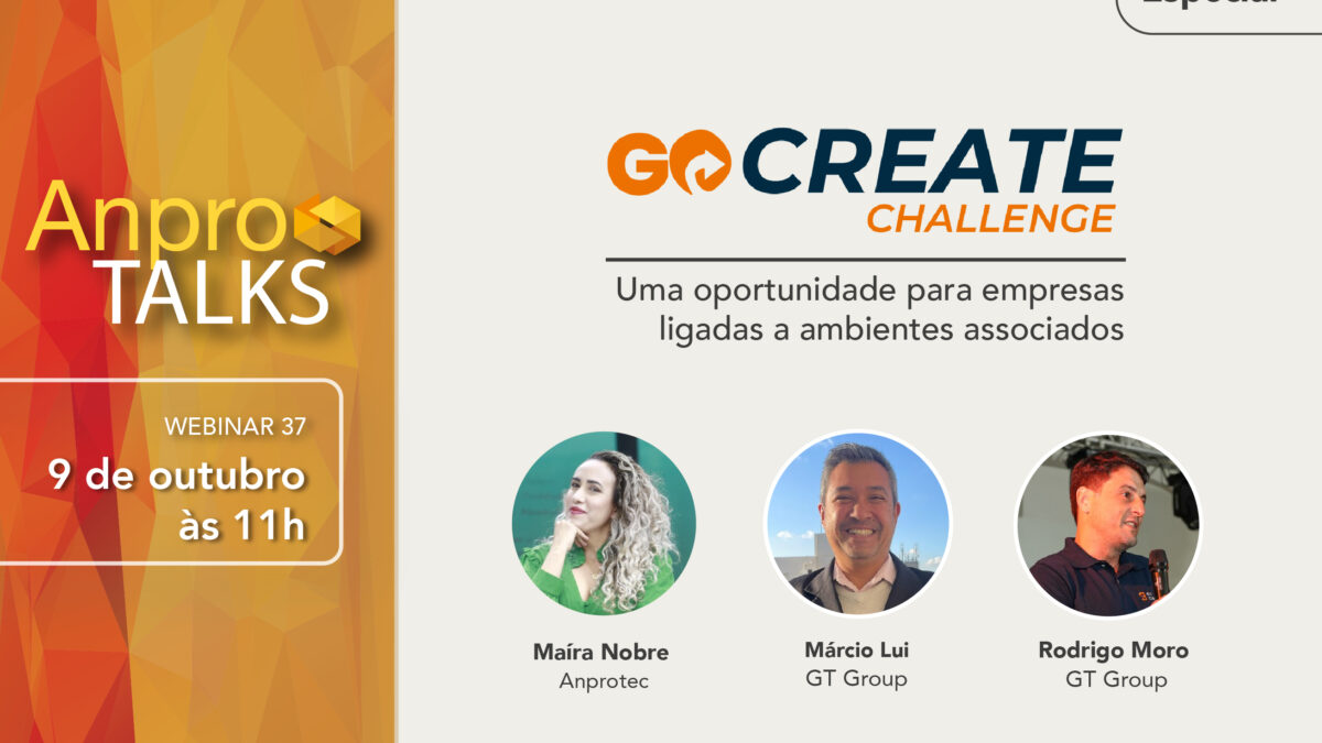 Para entender os requisitos, leia o regulamento do GoCreate Challenge e realize sua inscrição no site até dia 15/10 ! Para saber mais sobre o desafio e sanar possíveis dúvidas, acompanhe o 37° AnproTalks no dia 09/10 no canal do Youtube da Anprotec.