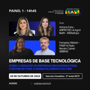 O primeiro painel, moderado por Públio Ribeiro (MCTI), explorou o impacto das empresas de base tecnológica e dos ambientes de inovação, como incubadoras e parques tecnológicos, no desenvolvimento econômico do Brasil.