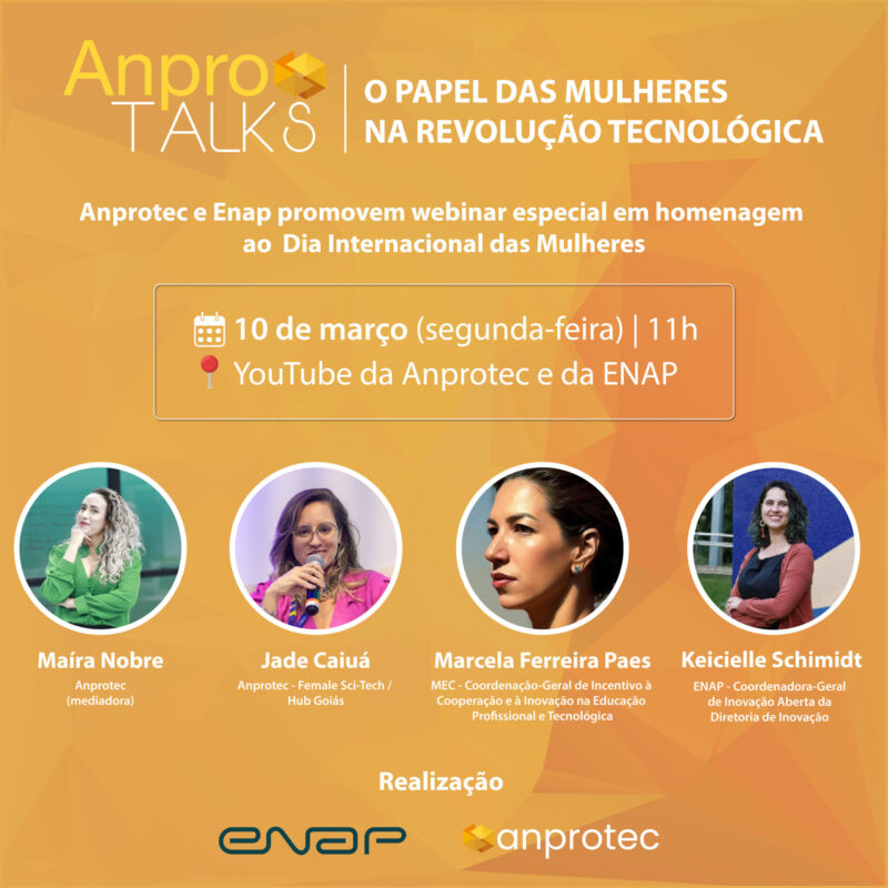 O Dia das Mulheres foi comemorado pela Anprotec e pela Escola Nacional de Administração Pública (ENAP) com o webinar Anprotalks “O papel das mulheres na revolução tecnológica” na manhã do dia 11 de março. O webinar, que teve transmissão no canal do Youtube de ambas instituições, teve a mediação feita pela Diretora de Redes e Associados, Maíra Nobre, da Anprotec.