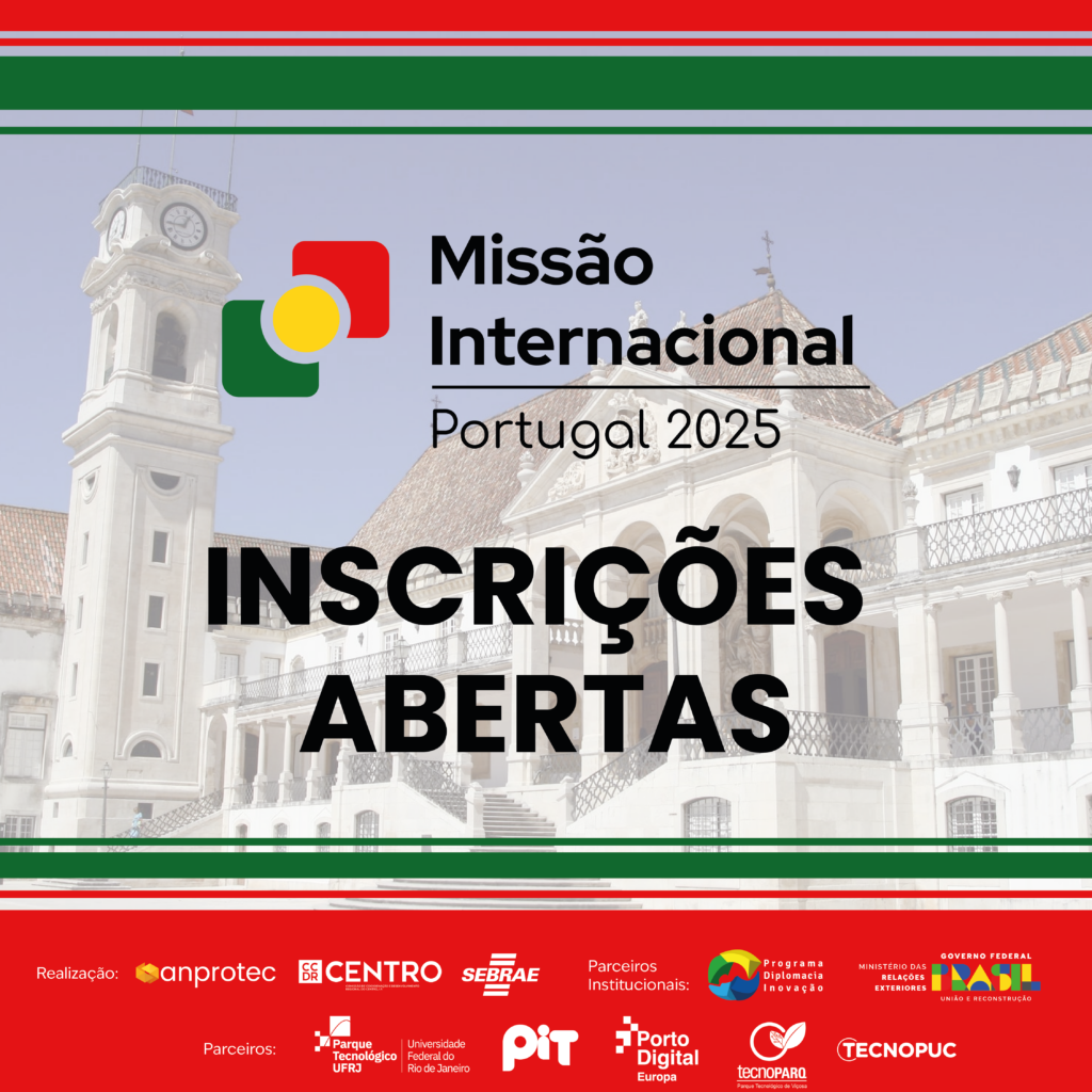 Entre os dias 23 e 26 de junho, a Anprotec promove a segunda edição da Missão Portugal, em parceria com o Serviço Brasileiro de Apoio às Micro e Pequenas Empresas (Sebrae), o Ministério das Relações Exteriores (MRE) e a Comissão de Coordenação e Desenvolvimento Regional do Centro (CCDRC – Portugal). As inscrições estão abertas até 20 de maio, inscreva-se!