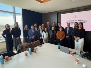 Na sequência, o grupo visitou o Georgetown Office of Technology Commercialization, escritório da Universidade de Georgetown responsável por gerenciar a transferência de tecnologia e a comercialização de inovações desenvolvidas por seus pesquisadores. A delegação foi recebida por Tatiana Litvin-Vechnyak, Vice-presidente do Escritório de Comercialização de Tecnologia e membro do Conselho de Administração da AUTM, e por Rohan Joy Mathew, especialista em Programa do Escritório de Comercialização de Tecnologia de Georgetown. O encontro foi uma oportunidade para compreender como a universidade estrutura seus processos de inovação e parcerias estratégicas.