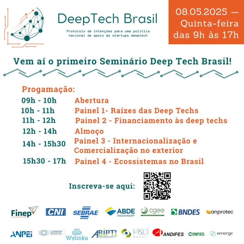 A programação do seminário conta com painéis sobre Raízes das Deep Techs, Financiamento destas instituições, Internacionalização e Comercialização no exterior e o Ecossistema brasileiro.